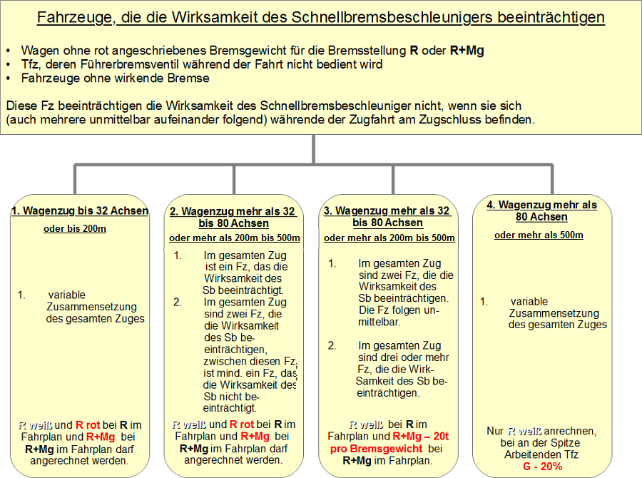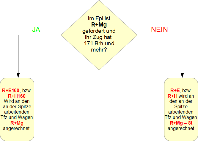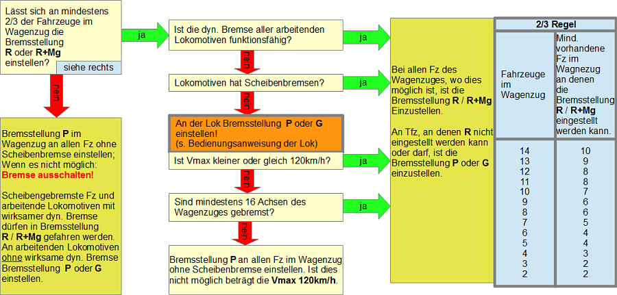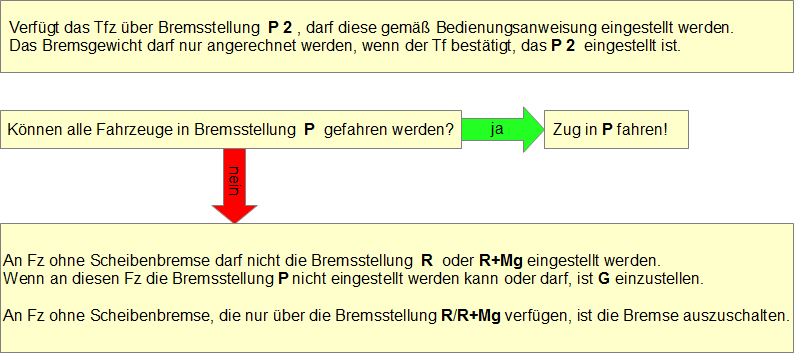 Übersicht über die Einstellung der Bremsstellungen bei Reisezügen: Grundsatz: Bei Reisezügen ist grundsätzlich die wirksamste Bremsstellung einzustellen. In den betrieblichen Anweisungen des EVU können abweichende Regeln bekanntgegeben werden. Im Fahrplan ist die Bremsstellung "P" gefordert: ![]() Im Fahrplan ist die Bremsstellung "R" oder "R+Mg" gefordert: ![]() Bremsberechnung: ![]() ![]() |
